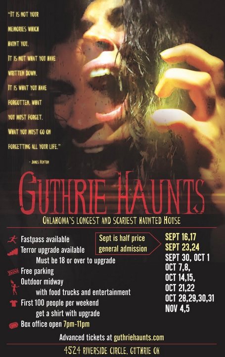 Guthrie Haunts Scaregrounds offers over 30,000 square feet of pure horror, including over half a mile of indoor and outdoor scares. To add to the fun, the haunt also features food trucks and outdoor entertainment.