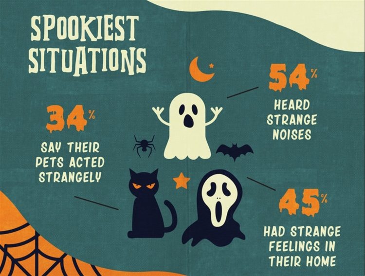 In fact, living in a haunted home is more common than you may think. Nearly two in five people believe they have lived in a haunted (or possibly haunted) house. And how do they know there’s some spook to the home? According to the survey conducted for the report, the spookiest behaviors include hearing strange noises (54%), sensing as if you’re being followed or odd feelings in certain rooms (45%) and erratic pet behavior (34%).